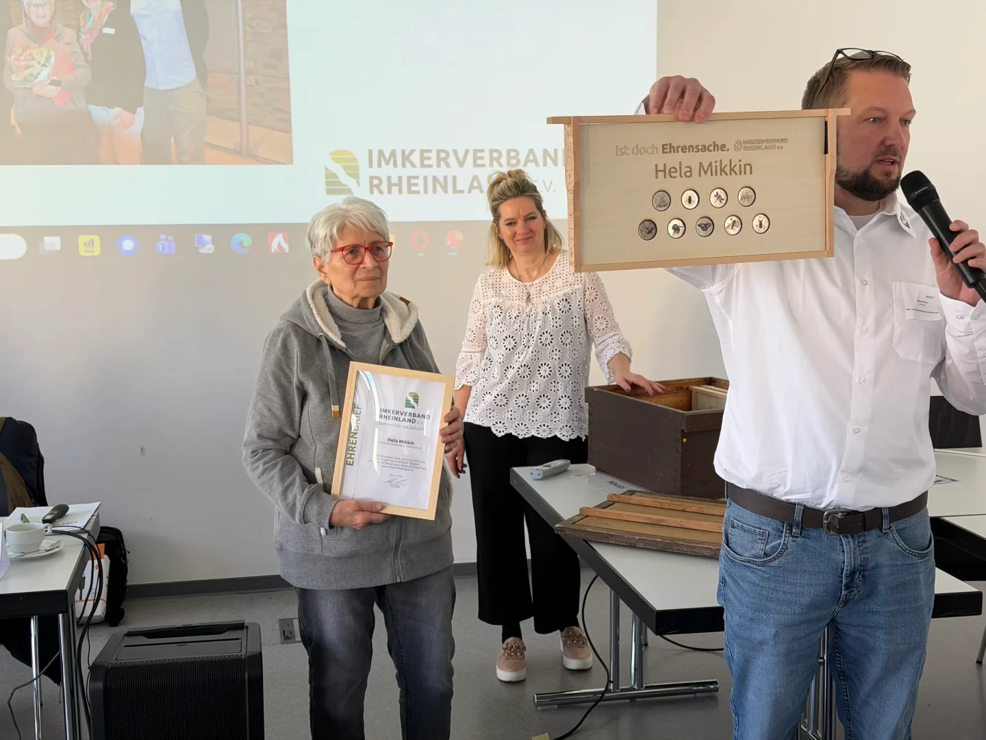 Hela Mikkin erhielt den äußerst seltenen Ehrenbrief des Verbandes. Die 85-Jährige gehört dem Imkerverband Rheinland noch nicht ganz so lange an, hat in dieser Zeit aber außerordentliches Engagement für ihren Verein und ihren Kreisverband Ruhrgebiet Witten an den Tag gelegt. Aus diesem Grund kam eine Ehrung mit dem Ehrenbrief in Frage.