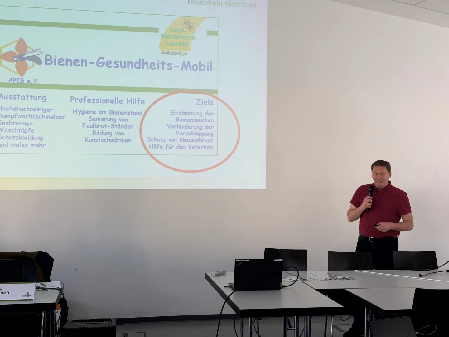 Von der Landwirtschaftskammer Nordrhein-Westfalen nahm Wolfgang Tacke an der Vertreterversammlung teil. Er hatte eigens ein BiG-Mobil nach Essen mitgebracht, um den Imkerinnen und Imkern das Konzept dieser schnellen Hilfe im Falle eines AFB-Ausbruchs vorzustellen. Sein Vortrag sowie seine praktische Vorführung stießen auf großes Interesse der Anwesenden.