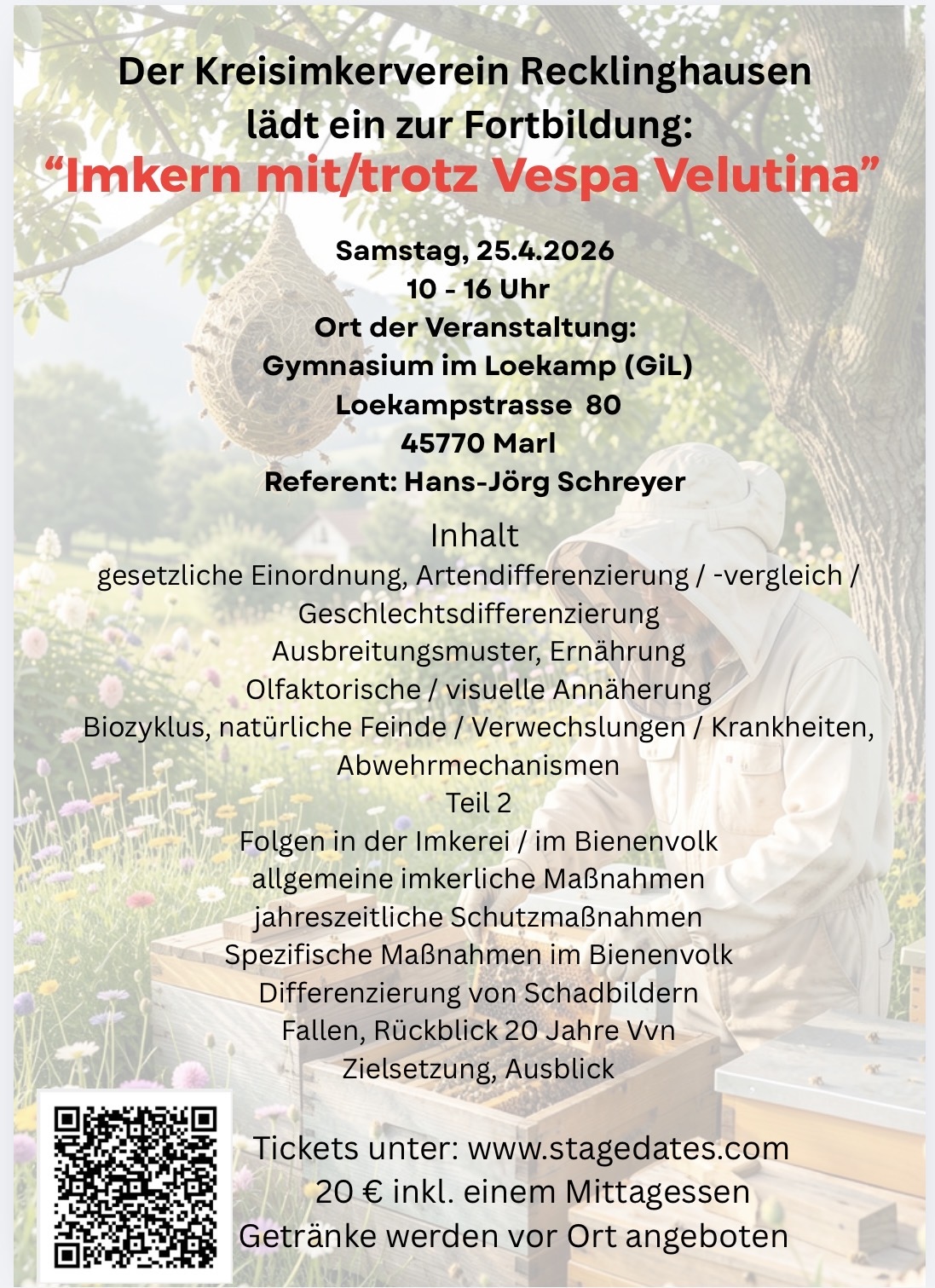 Samstag, 25.April Faszinosum heimische Stechimmen, mit pracktischen Bestimmungsübungen und fachkundenachweis . Dr. Pia AumeierSonntag, den 26. April Teamwork und kluge Entscheidungen - Neueste Infos rund um die Asiatische Hornisse Vespa Vellutina. Thomas Beissel